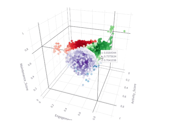 From various clustering techniques that we tried, K-means showed the best results that are visualized in the 3D plot, with the 3 composite scores as axis as illustrated in the below figure