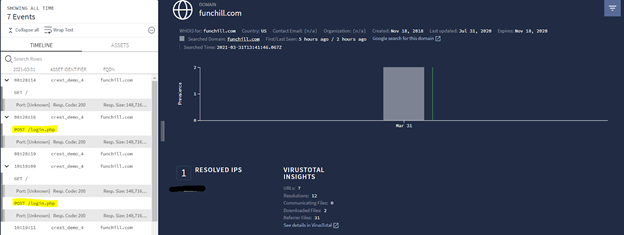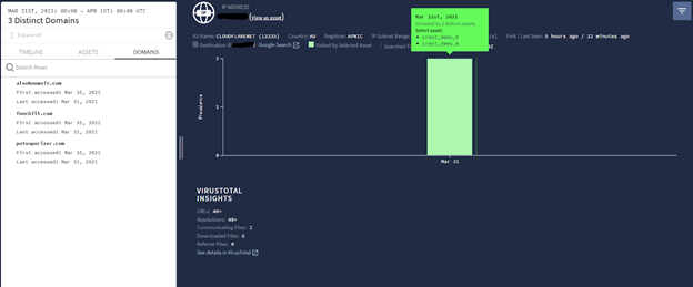 2. There are two distinct assets (crest_demo_4 and crest_demo_6) that have accessed the domain. And Mar31 was the date when the listed assets first accessed the domain.
