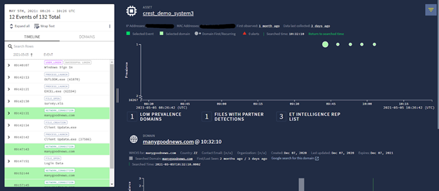 2. On click of “crest_demo_system3”, you can view the prevalence graph of it. Here you will be able to see that the user is accessing domains at intervals. You can filter the prevalence of domains. The domains showing at high prevalence shows that the domains are common to Chronicle and you can see only one domain “manygoodnews.com” having prevalence to 1 which indicates new to Chronicle.