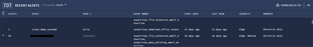 1. First, go to the Enterprise insights section. An alert for the user “alice” and assetname “crest_demo_system3” is raised which states malicious activity.
