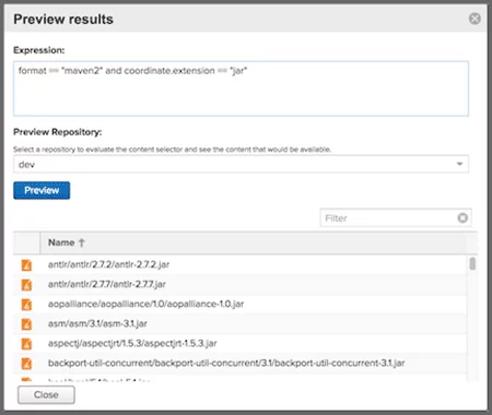 To see results your selector would find, select a repository or grouping of repositories from the Preview Repository dropdown and click the Preview button. Assets that match will be returned in the space below the filter and can be filtered upon if you wish to check on a specific result. The Name column is also sortable in ascending or descending order. Close returns you to the content selector creation screen.