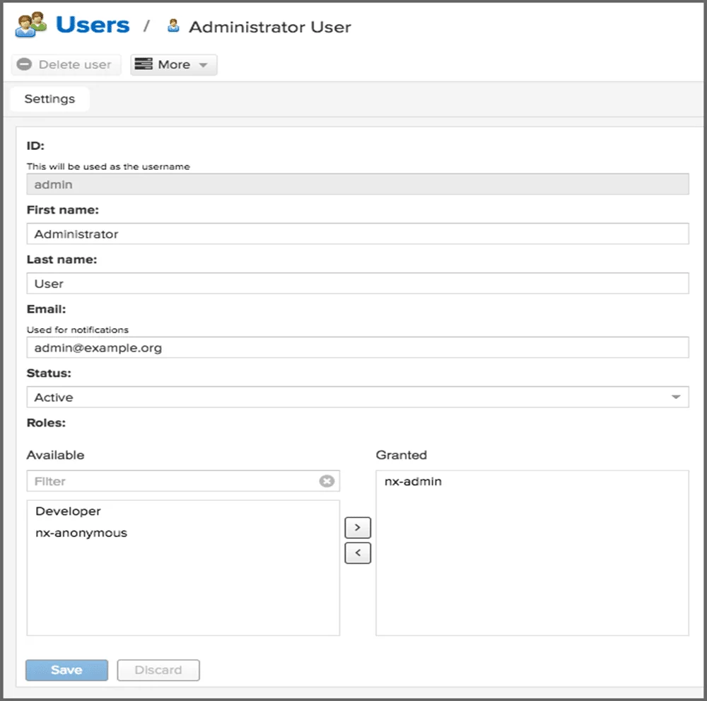 Users: User can be assigned one or more roles, and model the individuals who will be logging into the user interface and read, deploy, or manage repositories as well as connect from customer tools such as Apache Maven.