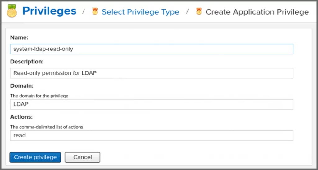 When creating a new Application privilege, you generally need to include the Name, Description, Domain, and actions associated with the privilege.