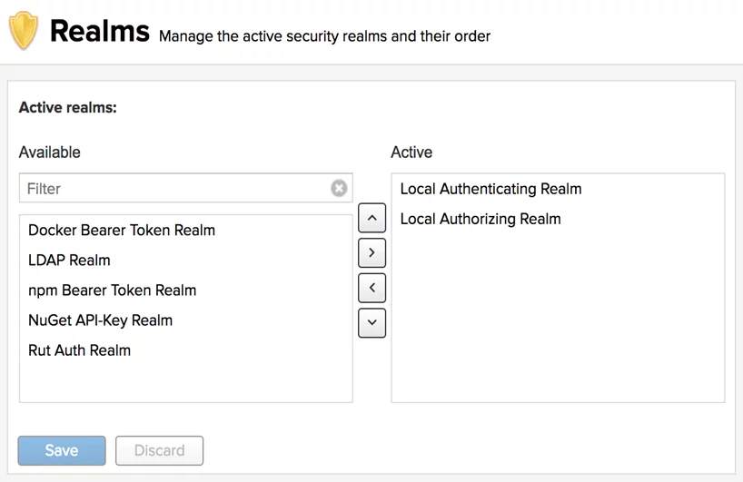 Local Authenticating Realm and Local Authorizing Realm: built-in realms used by default. They allow the repository manager to manage security setup without additional external systems. The recommenced ordering is to keep the local realms at the top of the active list, that way in the event of system recovery, if you have them lower in the order (or removed), then restoration may be more difficult.