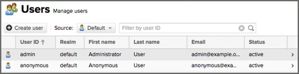 The user feature view can be accessed via the Users item in the Security section of the Administration menu. The initial view lists the users alongside their User ID, First Name, Last Name and email, as well as what security Realm is elected and if the accounts status is active or disabled. The default security realm is the local NXRM realm. An example of the users display is: