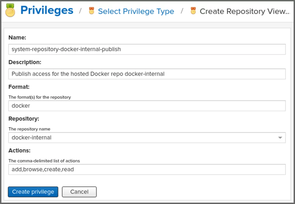 Click the create privilege button to view a list of privilege types. Select the corresponding are of the repository manager you wish to grant permissions. When you create a new Privilege type, you must assign at least one action in the actions field.