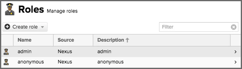 Roles aggregate privileges into a related context and can be grouped to create more complex roles. The Repository Manger ships with a predefined admin as well as an anonymous roles.