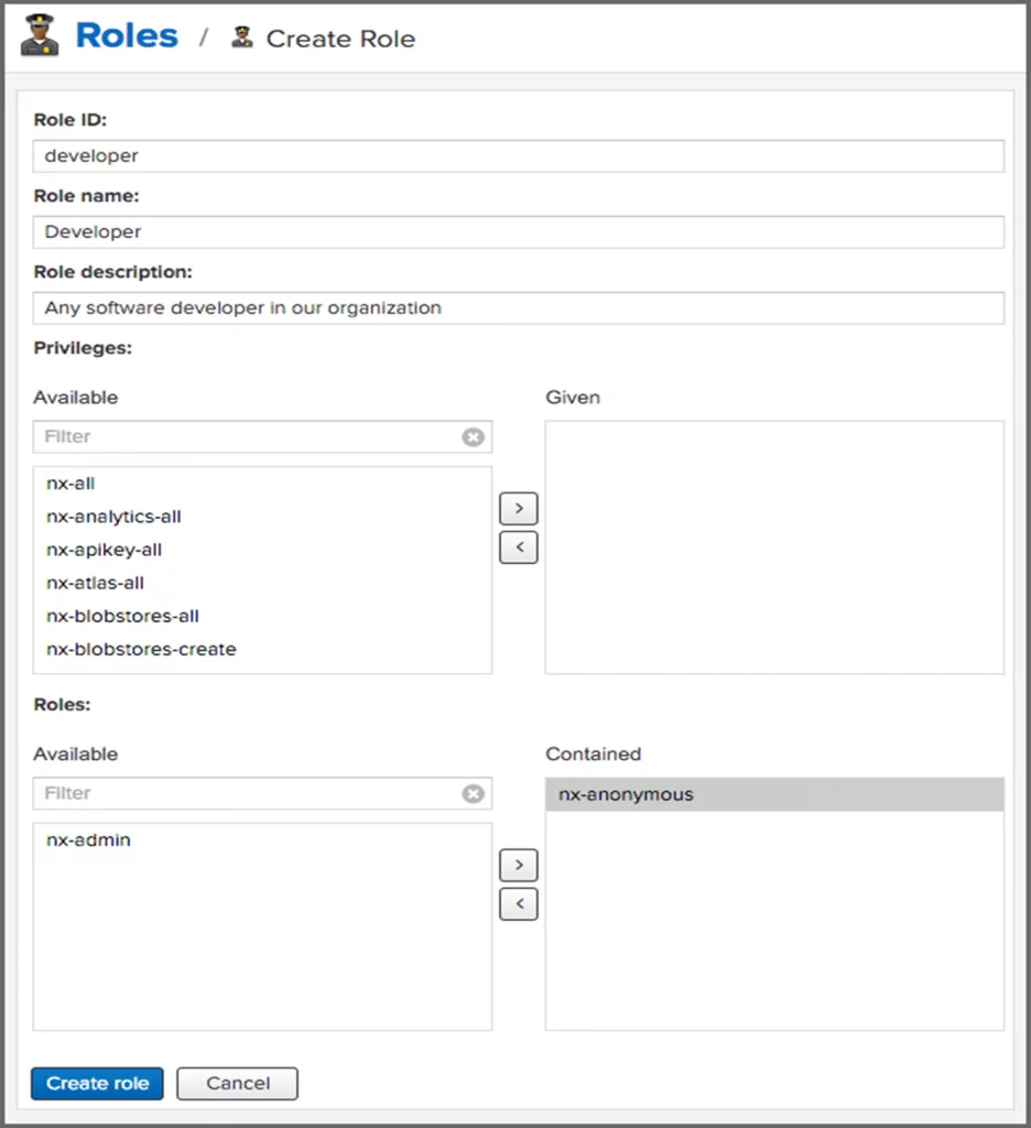 To create a new role, click the Create Role button, select Nexus Role and fill out the Role Create feature When creating a new role, you will need to supply a Role ID, and a name and optionally a Description. Roles are comprised of either roles and individual privileges. To assign a role or privilege to a role, drag and drop the desired privileges from the available list to the given list under the privileges header. You can filter to narrow down the list of displayed privileges and the arrow buttons to add or remove privileges.
