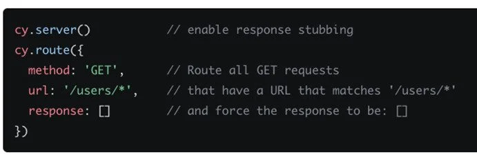 One last feature of Cypress is called stubbing. Stubbing is essentially mocking requests and responses. As shown in the image below cy.route() takes in a set of parameters to shape your http response or request.