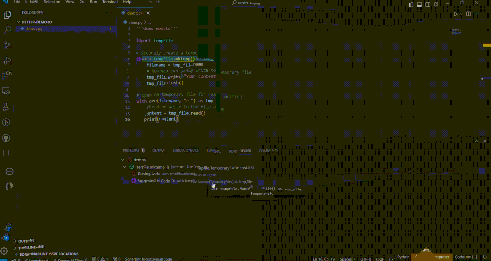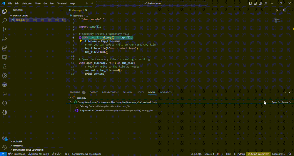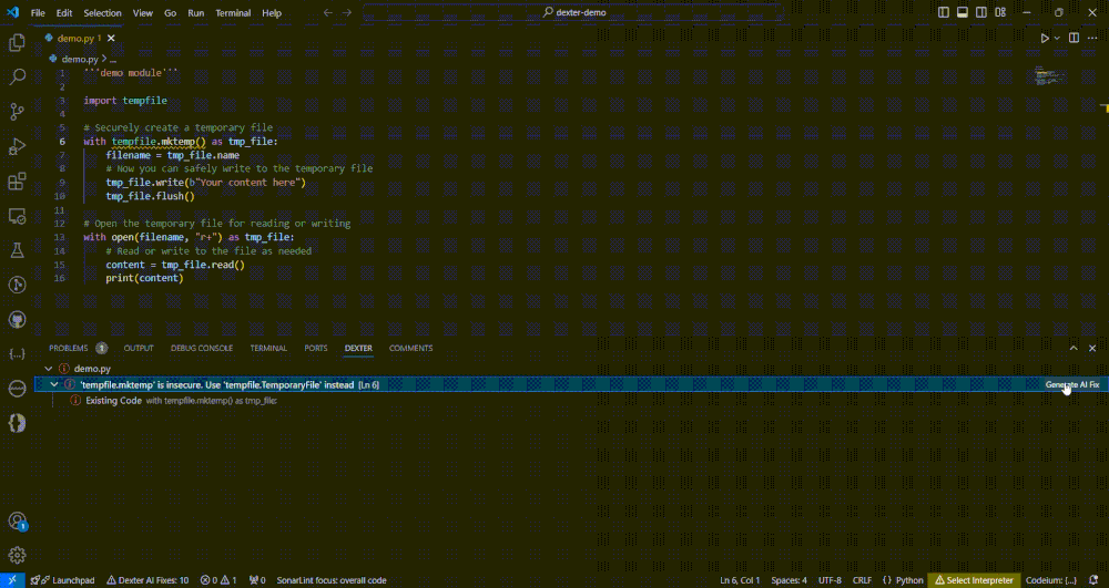 Currently, we offer a VSCode extension supporting Python programming language that works seamlessly with popular linting tools (e.g. Sonarlint) to enhance code smell detection. Once an issue is identified, Dexter.ai provides developers with intelligent, AI-generated fixes, streamlining the process of maintaining clean, efficient code.
